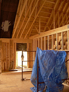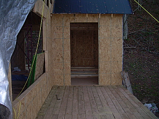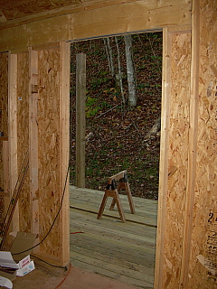 Above, left, the living room where you can see the cathedral ceiling in the framing. There will be a double window here to the left of the front door, and above one of the dormers will let in more natural light. To the right, the back porch as viewed through the kitchen door.