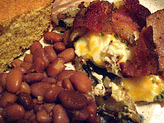 Cook bacon in a large frying pan, remove, drain, and chop; set aside. Using the same pan with the reserved bacon fat, fry ramps and potatoes over low heat, covered, till potatoes are tender. Crack eggs over the ramps/potatoes mixture and fry, covered, till eggs are done to your liking. Sprinkle on some shredded Cheddar or Swiss-or not, depending on your preference. Season with salt, pepper, and chives to taste. Remove each egg with its ramps/potato bed onto serving plates; top with chopped bacon. Pass the pinto beans and cornbread! (Serves 5-increase or decrease recipe according to your needs.)