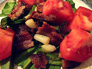 Cook bacon in a large frying pan, remove, drain, and crumble; set aside. Using the same pan with the reserved bacon fat, fry ramps over medium heat for about 5 minutes or till tender. Divide leafy greens onto salad plates and spoon hot ramps with bacon liquid immediately onto the leaves to wilt them slightly. Toss gently; add tomatoes, season with salt and pepper to taste, and crumble bacon on top. Serves 4 as side salads or 2 as a meal with your favorite bread. (For a vegetarian alternative, omit bacon and use olive oil.)