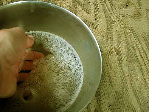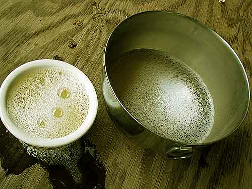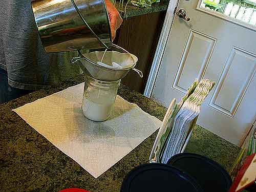 Then I slowly pour the milk from the pail into the filtered strainer.