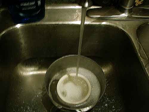 Next I drop a larger splash of bleach into the milking pail in the sink and run hot water into the pail.
