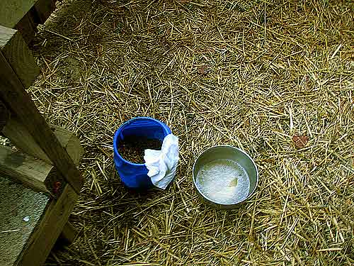 Each morning, when I prepare to milk Clover, I assemble my equipment, starting with the small bowl and cup I use for the udder wash and teat dip.