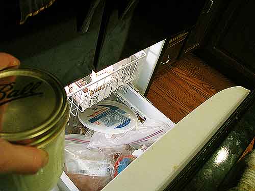 I use glass pint jars because I get a pint of milk from Clover per milking. I immediately place the pint jar in the freezer. Other ways to chill milk rapidly include placing the milk inside a bowl of ice water in the refrigerator or even specialized milk cooling equipment (for the extensive home dairy!). I find placing the pint jar in the freezer the simplest method for me, with my one pint of milk and my one little goat.