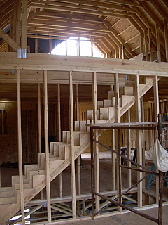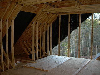 Above, left, the living room where you can see the cathedral ceiling in the framing. There will be a double window here to the left of the front door, and above one of the dormers will let in more natural light. To the right, the back porch as viewed through the kitchen door.