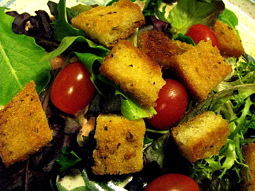 (An alternate method to prepping the croutons is to pour the oil-seasonings into a gallon-size plastic storage bag, cubing the bread slices, putting the croutons into the mixture in the bag, closing the bag and shaking to combine the croutons with the oil-seasonings. This is easier and less messy, but I think I get more yummy seasoned oil into the croutons doing it the hard way.)