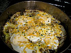 Cook bacon in a large frying pan, remove, drain, and chop; set aside. Using the same pan with the reserved bacon fat, fry ramps and potatoes over low heat, covered, till potatoes are tender. Crack eggs over the ramps/potatoes mixture and fry, covered, till eggs are done to your liking. Sprinkle on some shredded Cheddar or Swiss-or not, depending on your preference. Season with salt, pepper, and chives to taste. Remove each egg with its ramps/potato bed onto serving plates; top with chopped bacon. Pass the pinto beans and cornbread! (Serves 5-increase or decrease recipe according to your needs.)