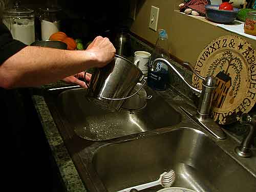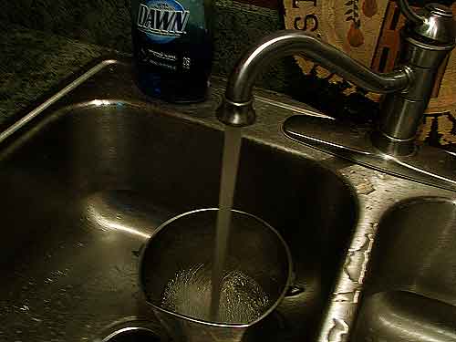 The Fias Co Farm site recommends filling the sink with hot water and bleach and immersing the pail. I find this far too wasteful of water and bleach for my purposes with one small pail. I just set the pail in the sink with that splash of bleach and fill it with hot water. I let it sit for a couple of minutes, then I pour some of the bleach water over the strainer to sanitize the strainer.