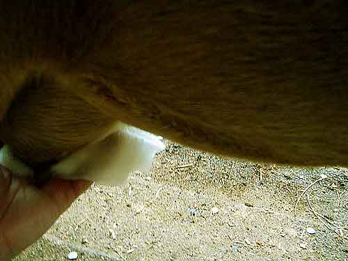 I soak a paper towel with the udder wash solution and wash Clover’s entire udder area, drying it with another paper towel.