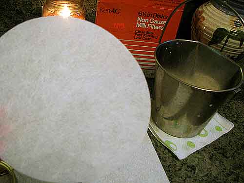 Before chilling the milk, I wash my hands then take out a fresh milk filter. Milk filters (available at farm supply stores) are somewhat similar to coffee filters, but not exactly. Get real milk filters. Don’t use coffee filters.