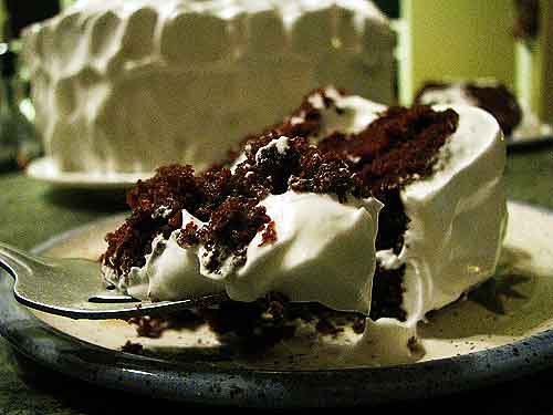 Combine sugar, water, and cream of tartar in a pan on the stove. Cook till bubbly and sugar is dissolved. In a bowl, combine egg whites and vanilla. Add sugar mixture to egg whites, a little at a time, beating constantly. Continue beating until stiff peaks form. Easily frosts a two-layer cake. I can’t stand it when a recipe doesn’t make enough frosting. This one makes plenty. When you first make the frosting, it will be a bit warm from cooking the sugar-water mixture. It spreads easier if you refrigerate it for 30 minutes before frosting the cake. Make the icing while the cake is baking.